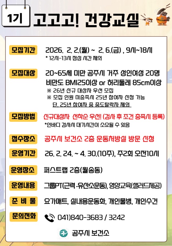2026년 고고고! 건강교실 1기 대상자 모집 (성인여성비만예방관리 프로그램)