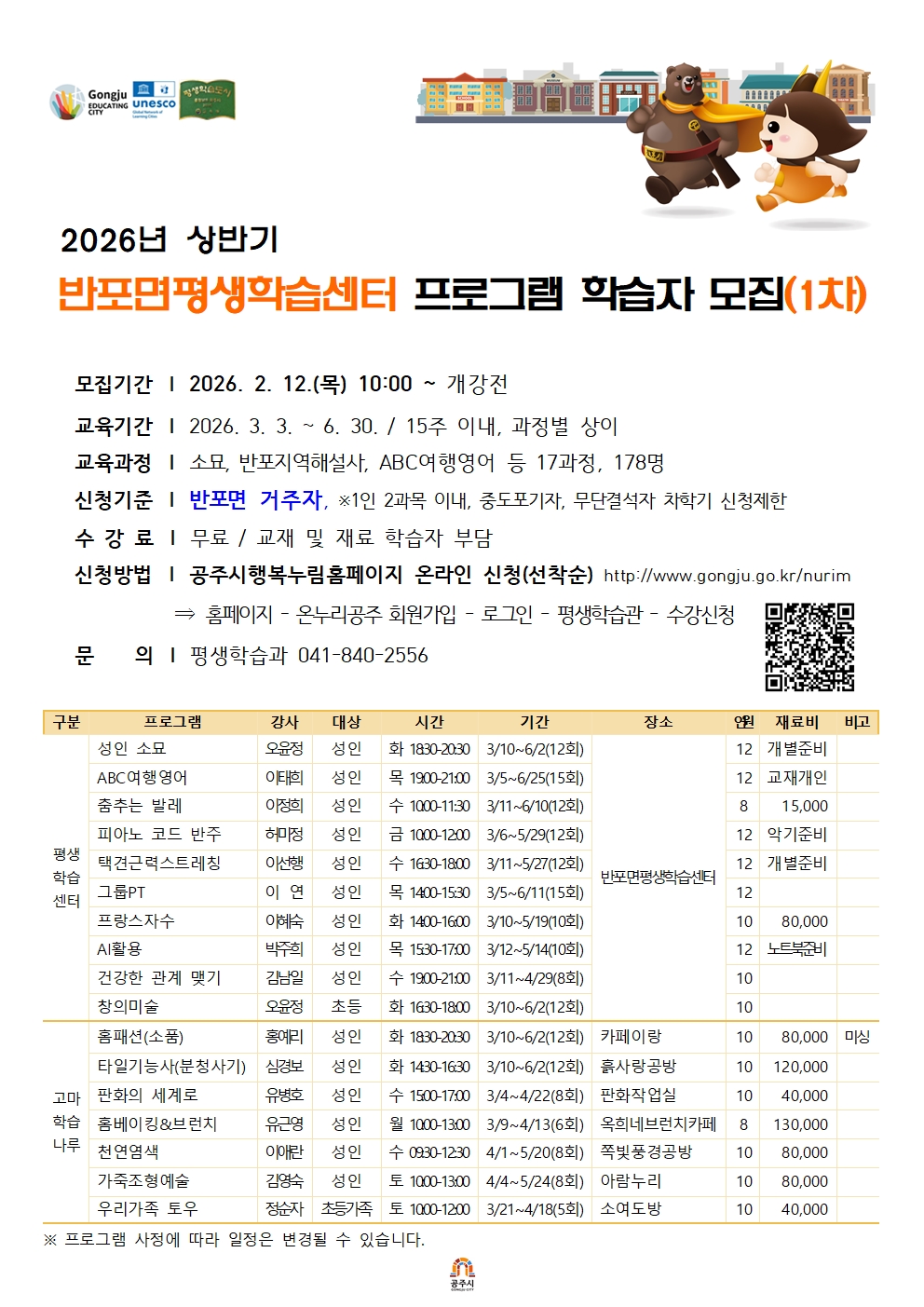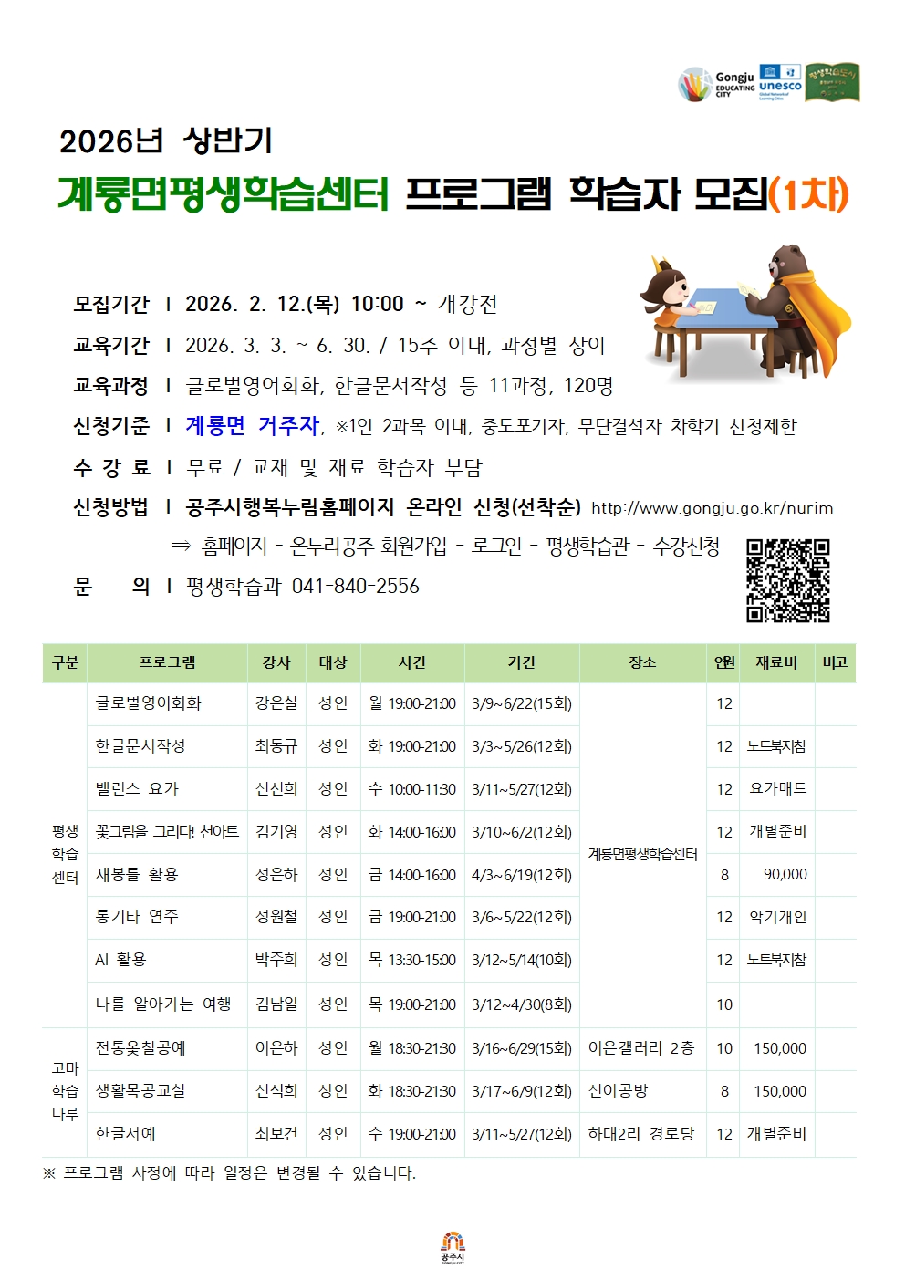 2026년 상반기 계룡면·반포면 평생학습센터 프로그램 학습자 모집(1차)